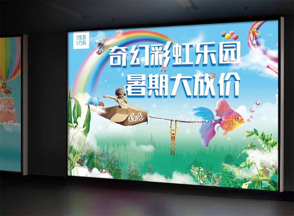 7月暑期档项目推出“奇幻彩虹乐园,暑假大放价”主题,并针对家长和儿童策划了系列活动,因此我们用超现实主义的表现手法,使用动植物元素灵动的描绘了一个奇幻、妙趣的森林主题世界。